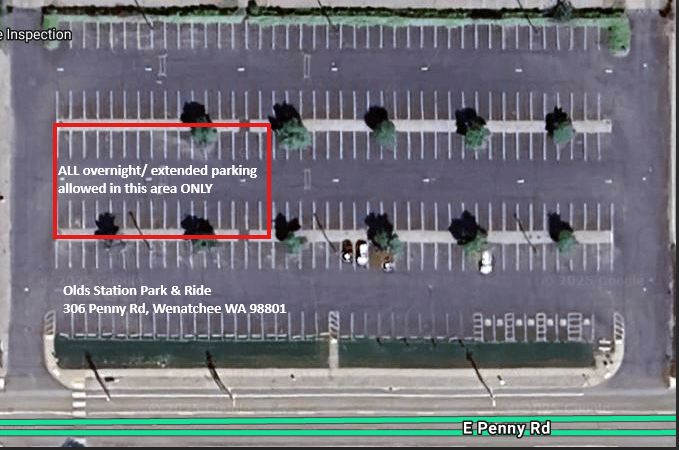 Olds Station Park and Ride lot on Penny Rd (next to Mid Valley Automotive), is only utilized during the busy Holiday Season. You will need to contact Link Guest Services at 509-662-1155 AFTER you make your reservation with WVS. Link will issue you a free parking permit for overnight or extended stay. Please review the map and park accordingly.