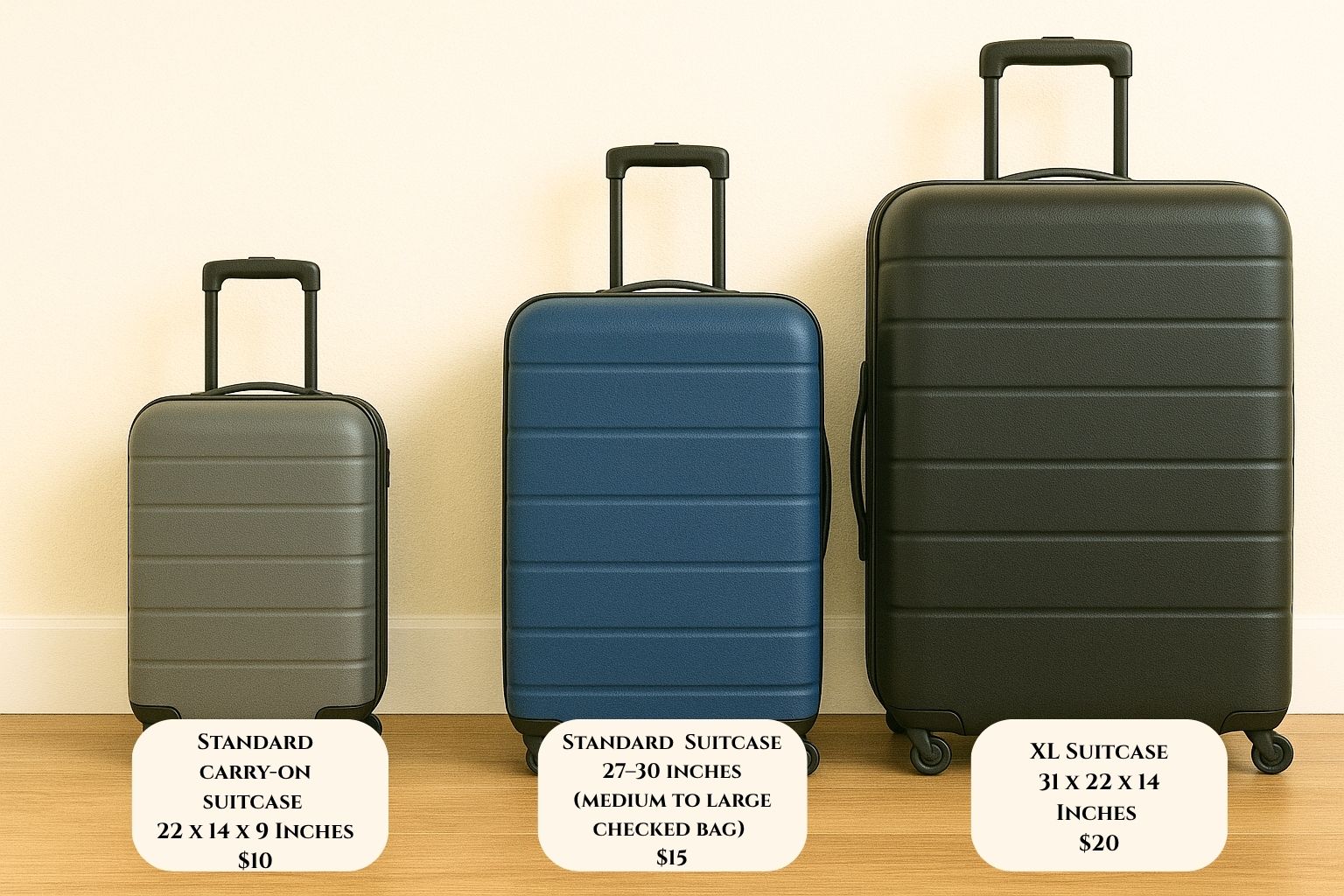 - Standard suitcases (27-30 in tall) are $15 each per reservation.