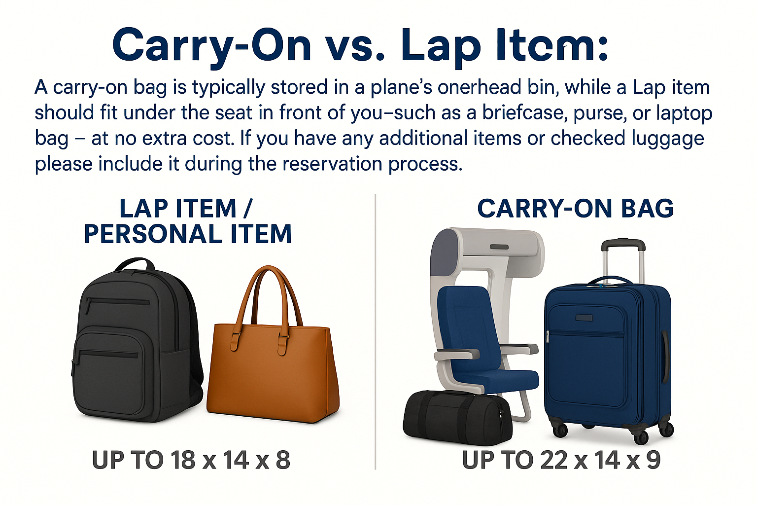 - 1 carry-on bag and 1 small personal item (like a purse or school sized backpack).